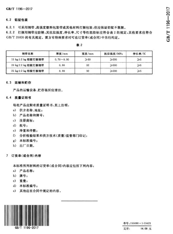 新版標(biāo)準(zhǔn)中取消了鋁錠打捆形式采用“井”字形或其他形式的規(guī)定,僅對(duì)打捆材料進(jìn)行了規(guī)定,要求打捆材料“可采用鋼帶、高強(qiáng)度塑料包裝帶或其他材料,但應(yīng)保證鋁錠不散捆”,同時(shí)“打捆用鋼帶應(yīng)防銹”,并對(duì)15 kg±2 kg、20 kg±2 kg、25 kg±2 kg鋁錠打捆用鋼帶的厚度、寬度、抗拉強(qiáng)度,伸長(zhǎng)率分別進(jìn)行了規(guī)定。需要注意的是,舊版標(biāo)準(zhǔn)要求打捆用鋼帶的“其他要求應(yīng)符合YB/T 025《包裝用鋼帶》的有關(guān)規(guī)定”,而新版標(biāo)準(zhǔn)要求打捆用鋼帶的“其他要求應(yīng)符合GB/T 25820《包裝用鋼帶》的有關(guān)規(guī)定”。